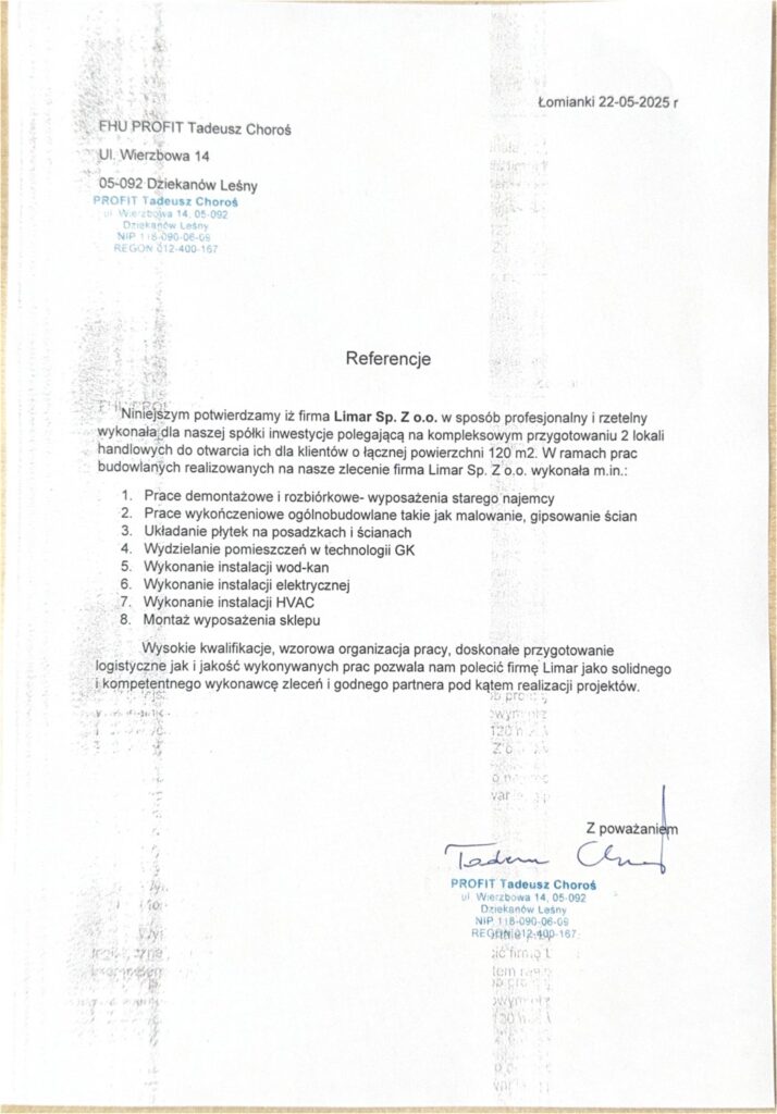 LIMAR Sp. z o.o. to firma budowlano-remontowa, powstała z przekształcenia firmy Margo Marcin Godleś. Działamy na terenie województw mazowieckiego, łódzkiego i podlaskiego, oferując kompleksowe usługi budowlane – od prac ziemnych, przez stany surowe, aż po prace wykończeniowe i adaptacyjne.